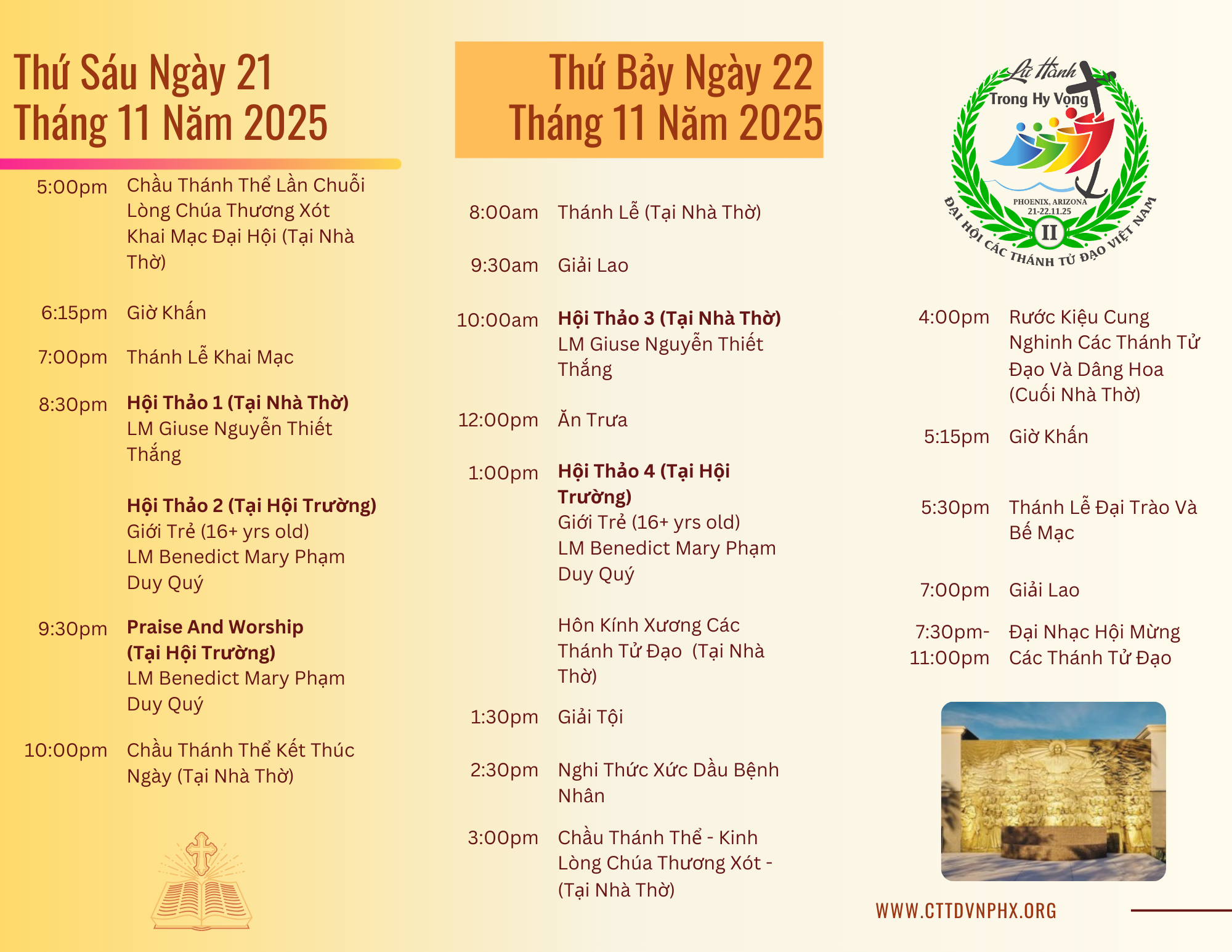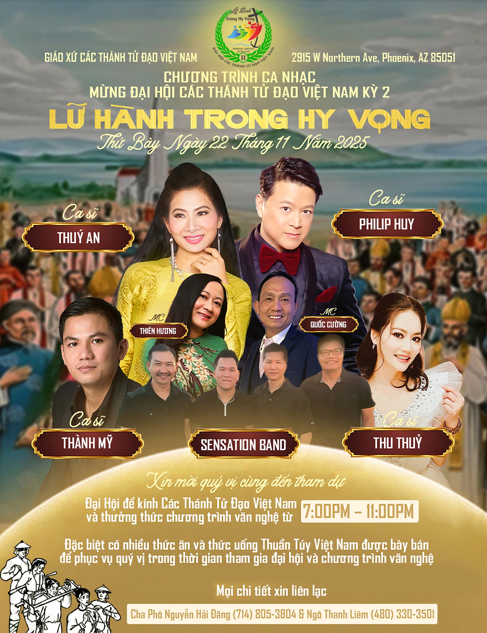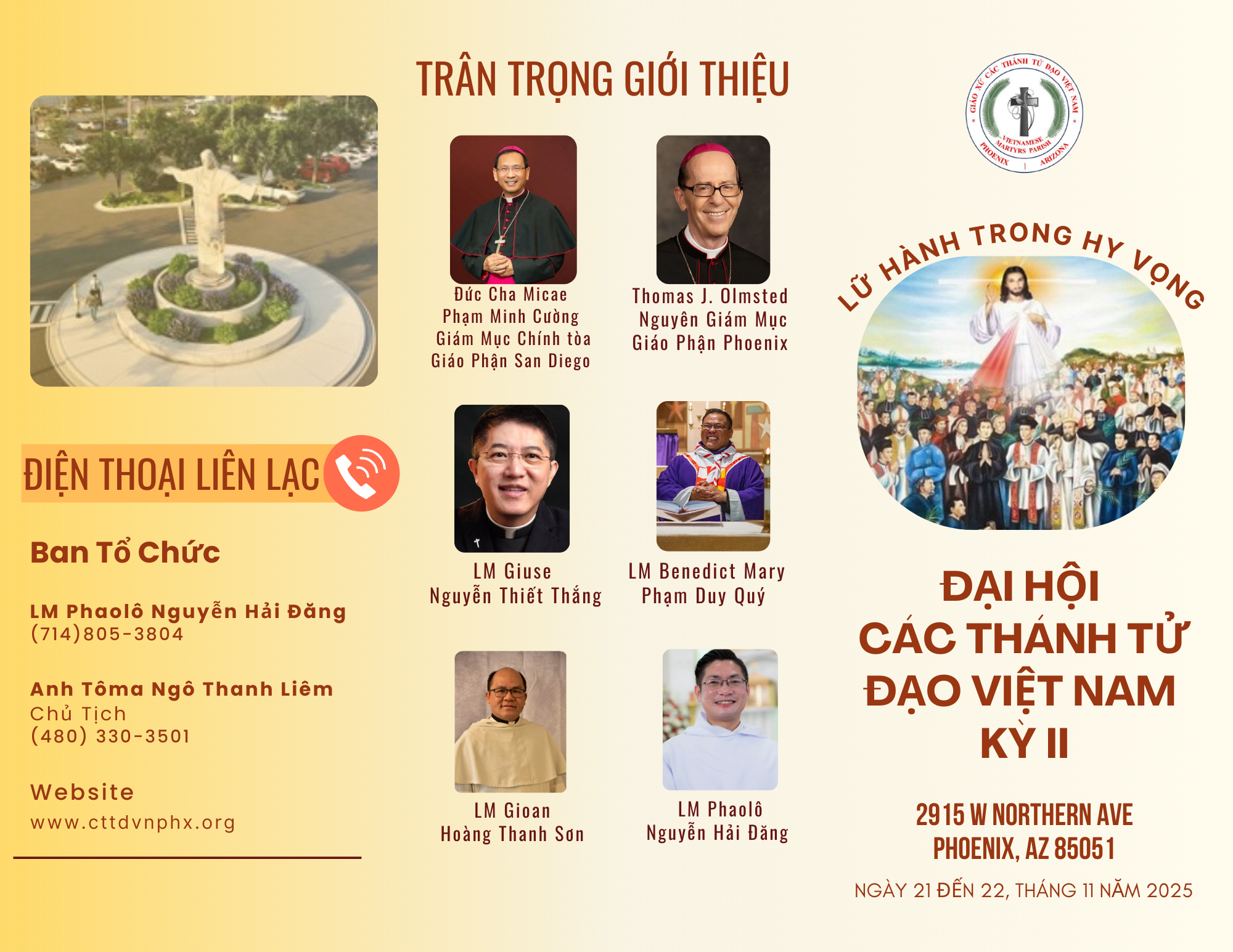 Đại hội sẽ diễn ra vào ngày 21-22 tháng 11 năm 2025 tại 2915 W Northern Ave, Phoenix, AZ 85051. Đây là cơ hội quý báu để chúng ta cùng nhau cầu nguyện, thờ phượng Thiên Chúa và đồng thời tôn vinh các Thánh Tử Đạo Việt Nam, củng cố đời sống đức tin và thắt chặt tình thân trong cộng đoàn. Giáo xứ rất hân hạnh được đón tiếp quý vị.